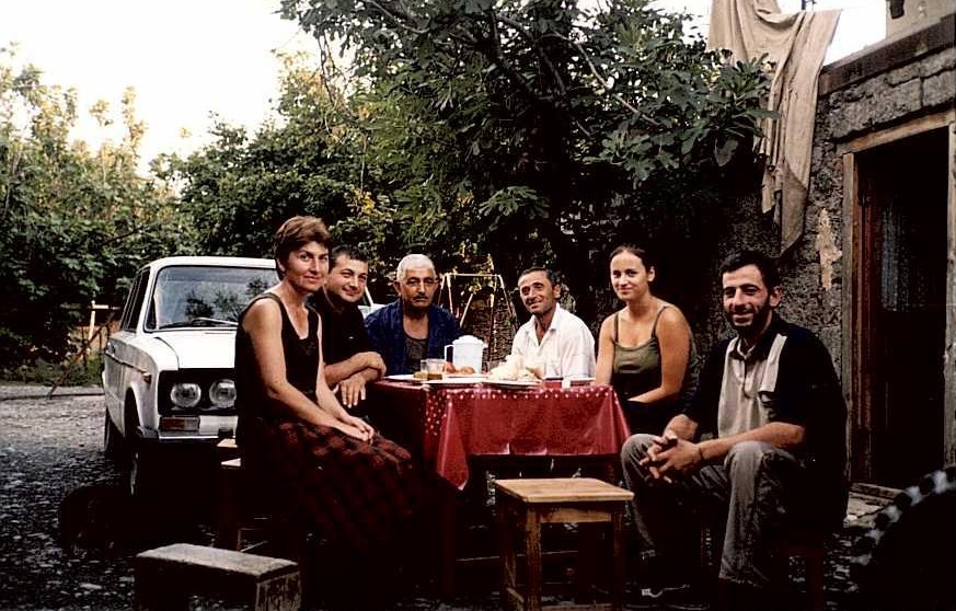wracając do mojej rodziny, spędziłam z nimi dwa wspaniałe dni. potem faktycznie przez wioskę przejeżdżała ciężarówka, która zabrała mnie w góry. jechał nią do swojego domu w górach akurat ich znajomy, który mnie zabrał, dwa dni na miejscu przenocował i wyprawił w powrotną drogę. musiałam tylko zapłacić za benzynę. w drodze powrotnej również zatrzymałam się u swojej rodziny i teraz zupełnie czułam się jakbym wróciła do domu. od razu ustaliliśmy, że jak będę w tbilisi za dwa tygodnie, to mam koniecznie do nich zadzwonić, bo one już tam będą. i faktycznie, w drodze powrotnej z armenii zatrzymałam się u taniko na jeszcze trzy dni w tbilisi. z wierą i khati chodziłyśmy po mieście, pokazały mi miejsca, do których sama nigdy bym nie dotarła. poznałam kolejną porcję koleżanek, sąsiadek i kuzynek. a wieczorami siedziałyśmy w domu. przez większość czasu nie było prądu, więc siedziałyśmy przy świecach, grałyśmy w karty w duraka albo dziewczyny grały na pianinie i wspaniale śpiewały. jak tylko pojawiał się prąd, włączały telewizor i czar pryskał… kiedy taniko dowiedziała się, że najbardziej smakowały mi w gruzji chinkali, poszłyśmy na targ, kupiłyśmy co trzeba i razem z tanią, wierą i khati przez dwie godziny lepiłyśmy te przepyszne gruzińskie pierogi. moje jedyne zdjęcia z tamtego dnia wysłałam do nich po powrocie do polski, nie zostawiając sobie odbitki. mam nadzieję, że doszły i że czasem i one mnie wspomną. na drogę do domu dostałam jeszcze pół kilo przyprawy do chinkali.
