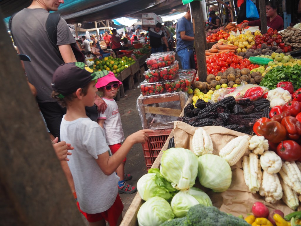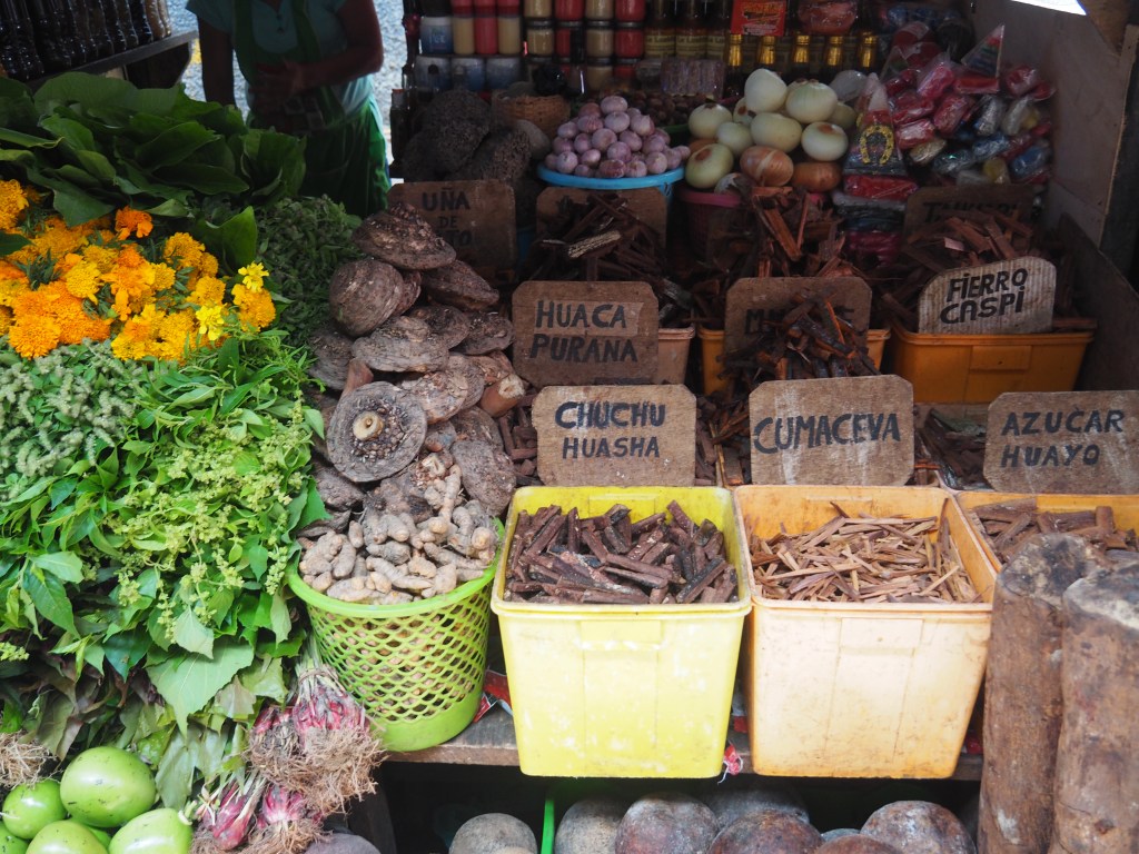 Najbardziej szalone było jednak targowisko w Iquitos, w środku peruwiańskiej Amazonii. Czego tam nie było! Były najwspanialsze owoce i świeżo wyciskane soki, podawane w zwykłych workach ze słomką. Były zupełnie nieznane nam warzywa, przyprawy, korzenie i bulwy. Były zwierzęta żywe i zaszlachtowane. Jaja żółwi i same żółwie, obrane ze skorupy i przekrojone na pół… Najbardziej szokująca była głowa (barania? kozia?), również przekrojona na pół. Witek długo jeszcze nie mógł uwierzyć, że to „naprawdę prawdziwy mózg”. Na targu można też było kupić najróżniejsze pamiątki i ozdoby z piór, pazurów, kłów i skóry zwierząt. Podejrzewam, że gdybyśmy wiedzieli czego i gdzie szukać, moglibyśmy tam znaleźć jeszcze inne skarby Amazonii, mniej lub bardziej halucynogenne. 😉